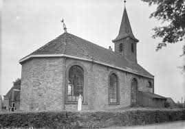 Herv.Kerk met dakruiter op kerkhof.